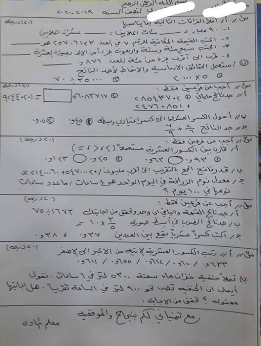الخامس الإبتدائي أسئلة مراجعة لمادة الرياضيات المنهج الجديد